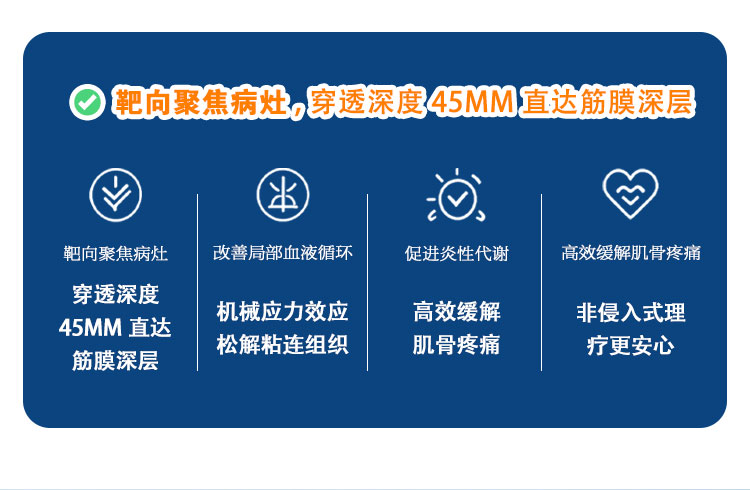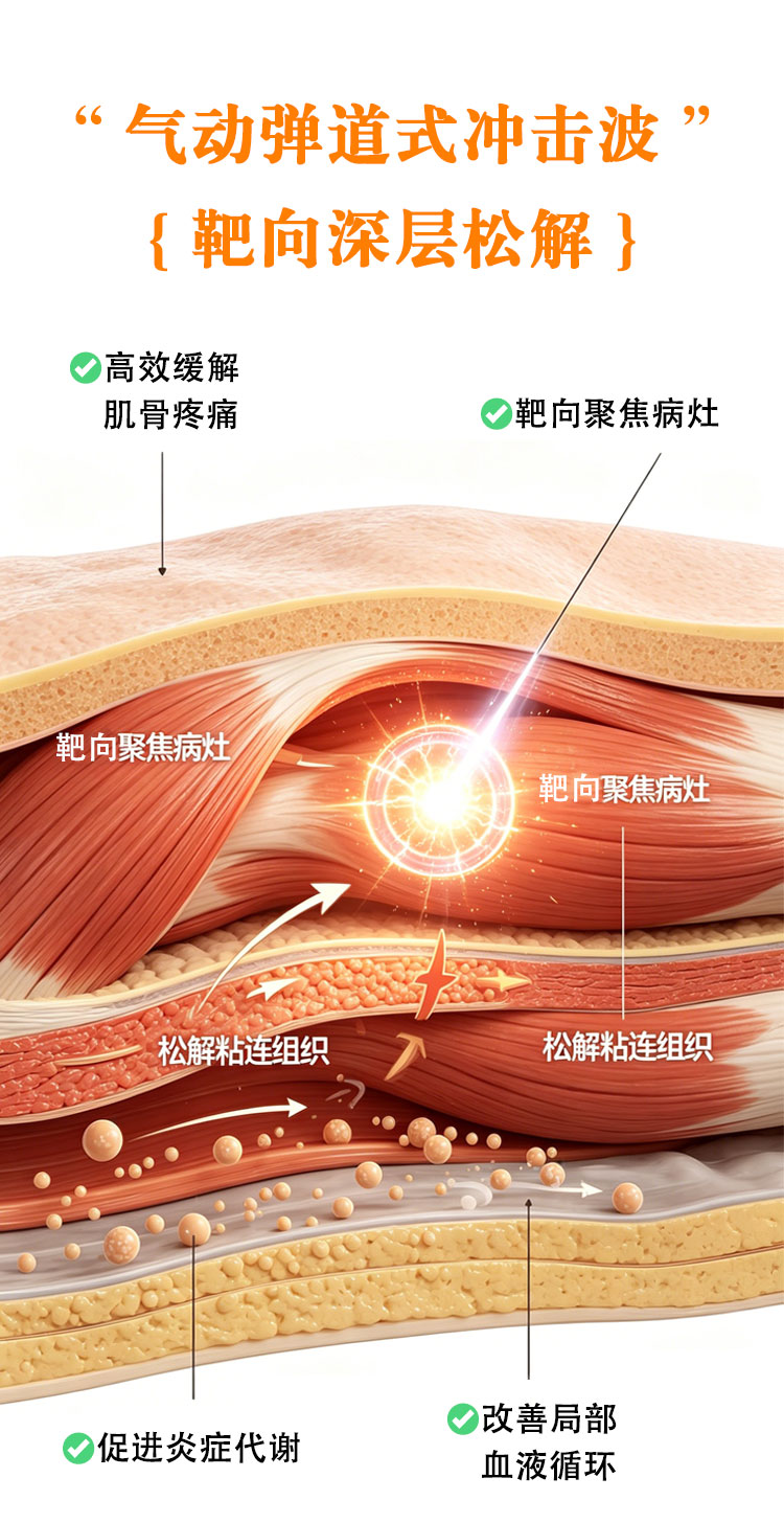 冲击波可以穿过体液和组织到达患处,在不同的声阻界面处会产生不同的机械拉应力和压应力。拉应力可以诱发组织间松懈,促进微循环;压应力可促使细胞弹性变形,增加细胞摄氧。